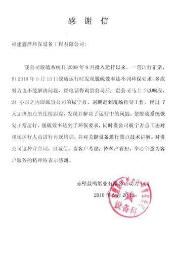 5月14日,我公司本着“想客户之所想,急客户之所急”的服务理念,即时安排副总工程师、项目经理赶赴赤壁晨鸣纸业有限公司烟气脱硫项目现场进行技术指导。针对13日客户提出的问题,他们加班加点,积极排查,并克服困难,完善处理了浆液平衡(已出石膏);纠正了滤布跑偏;通过更换塔体排放阀、石膏泵叶轮、机封及控制阀等解决问题,21日圆满完成了该脱硫系统整改等技术指导工作。目前系统正常运行,二氧化硫达标排放。
