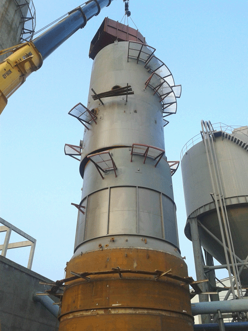 天,在项目部的统一安排下,各相关班组井然有序、积极配合,项目部时时检查施工人员的安全装备及施工周边的安全设施,,为吊装工作的顺利进展提供了坚实人力资源和安全基础。18时,上半段塔体成功吊装到位,经过一个多小时段焊固定,吊车脱钩,标志着脱硫塔封顶工作的顺利完成,项目取得了阶段性的成果,推进了下一道工序的开展。为确保合同工期目标的圆满完成,我公司将再接再厉,为实现项目建设目标而继续努力。